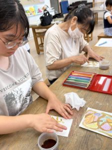 美術展に向けて概要の確認と、ワークショップの準備、「文字アート・秋(コーヒー画)」のレクチャーを行いました。